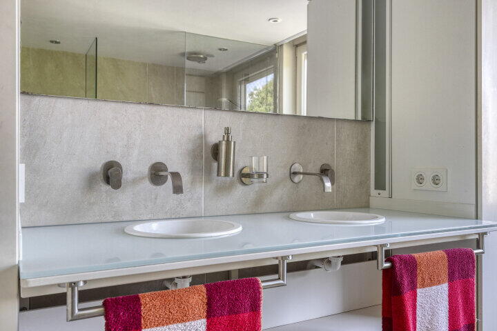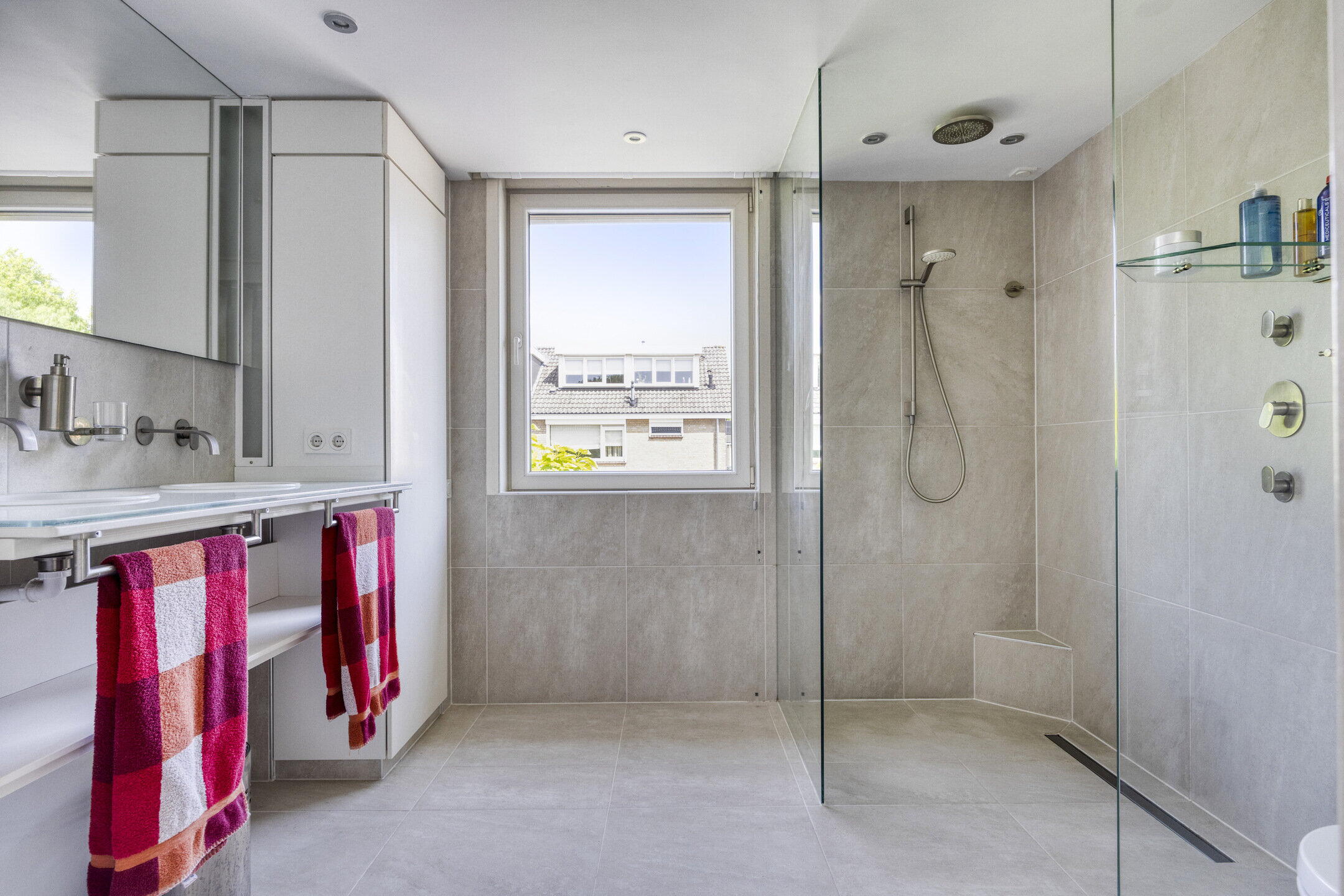 In de voormelde hal bevindt zich de trap naar de eerste verdieping. Daar vind je drie ruime slaapkamers voorzien van screens en een riante badkamer. De slaapkamers zijn mooie lichte vertrekken met een laminaatvloer en een praktische indeling. De luxe badkamer is gedeeltelijk betegeld en gedeeltelijk gestukt en is voorzien van 2 vaste wastafels, een tweede toilet en een heerlijke royale inloopdouche. Daarnaast heeft de badkamer een vergroot raam waardoor het extra licht wordt zonder inkijk op de doucheruimte.