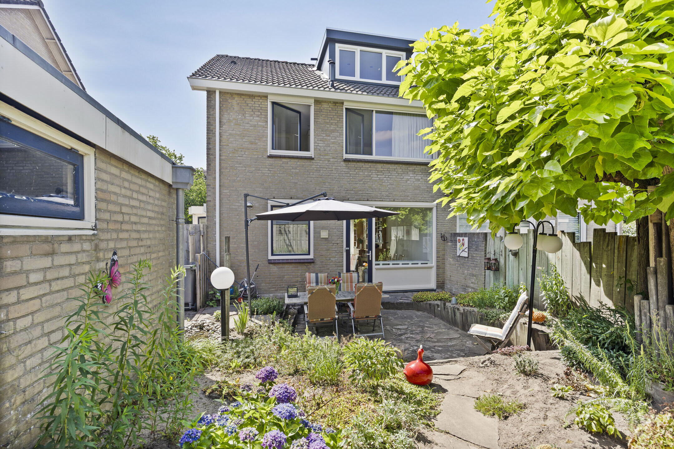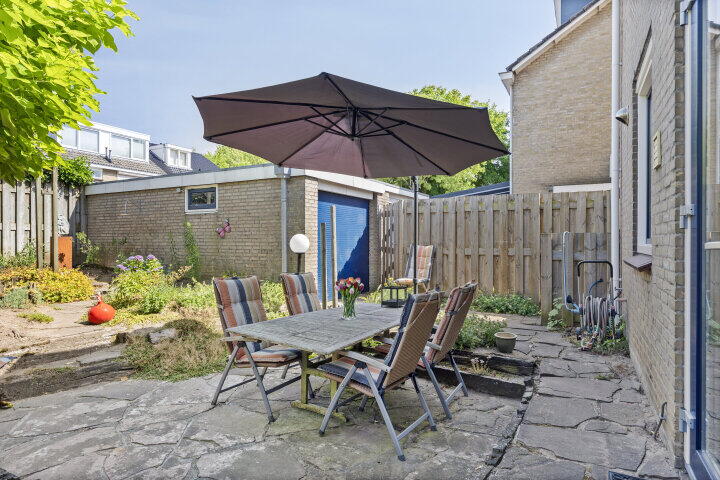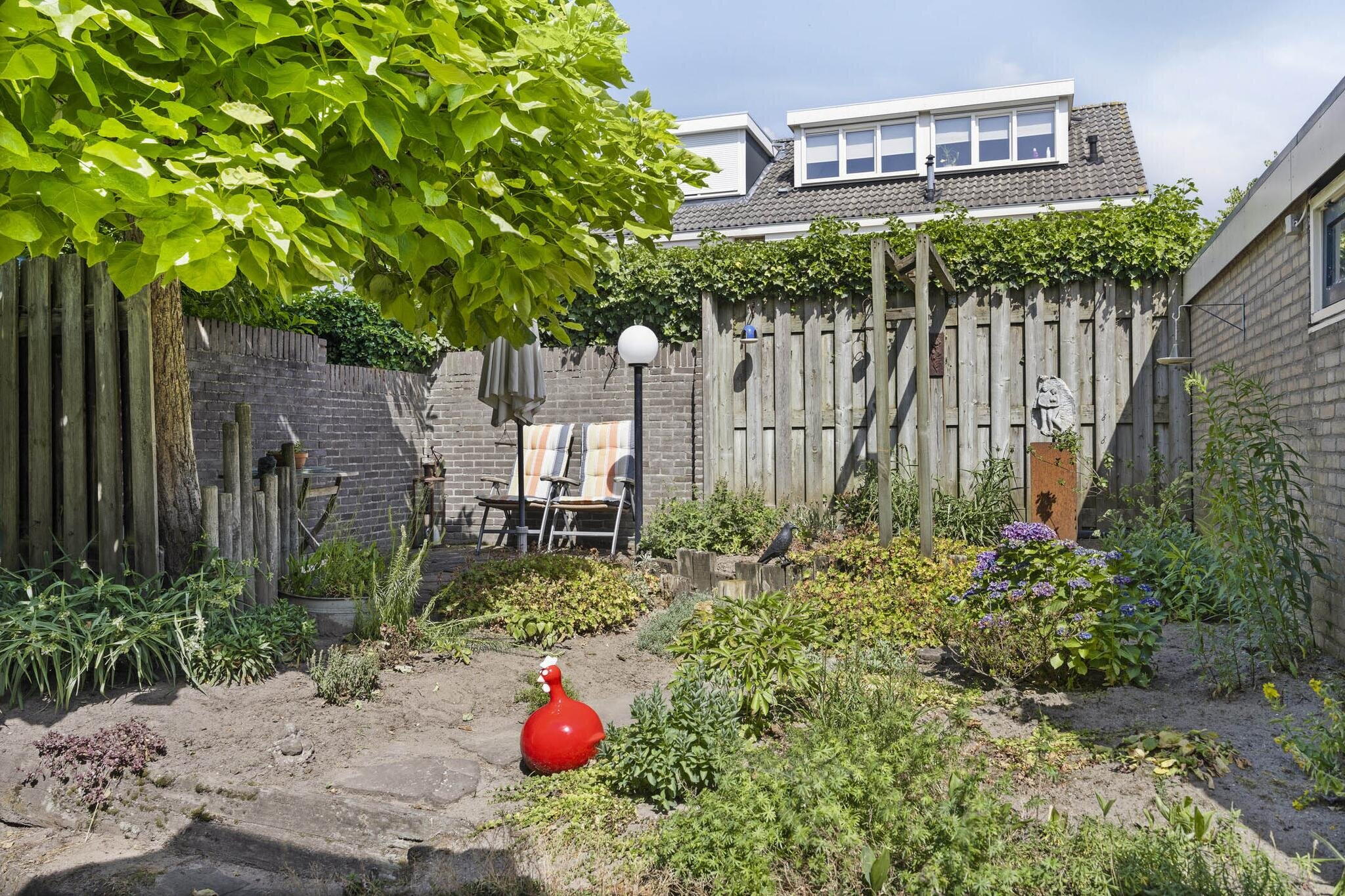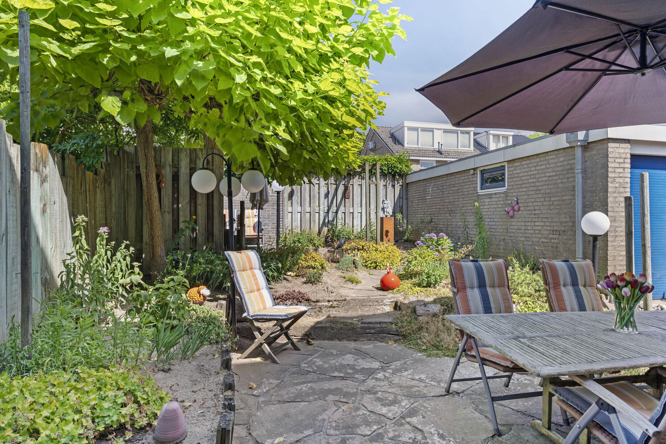 De woning beschikt over een voor- en achtertuin. De voortuin is voorzien van vaste beplanting. De achtertuin ligt op het oosten en is voorzien van sierbestrating, gras en borders met vaste beplanting. De vrijstaande garage achter in de tuin heeft een elektrische roldeur aan de straatzijde.