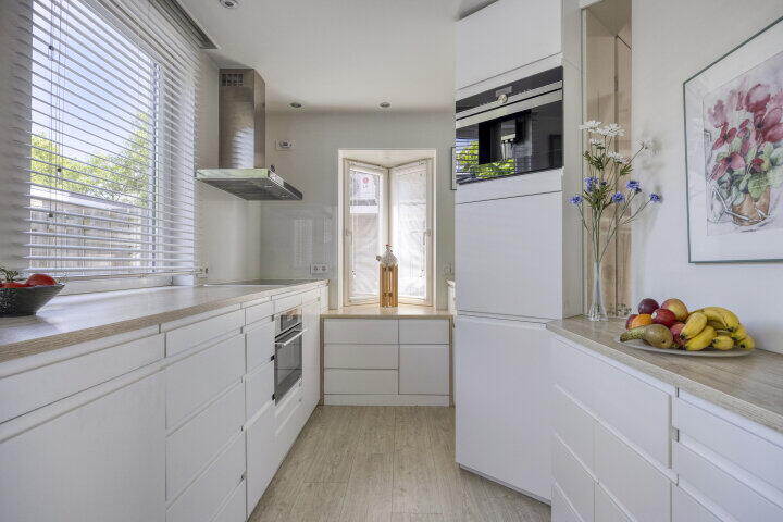 De luxe keuken is voorzien van veel kastruimte en diverse inbouwapparatuur. De boven- en onderkastjes zijn greeploos en is uitgerust met diverse inbouwapparatuur, zoals een inductiekookplaat, afwasmachine, combimagnetron, koffiezetapparaat en een quooker. Met genoeg ruimte voor een grote eettafel en een overvloedige lichtinval door de vele raampartijen wordt de eetkamer vast je favoriete plek in huis.